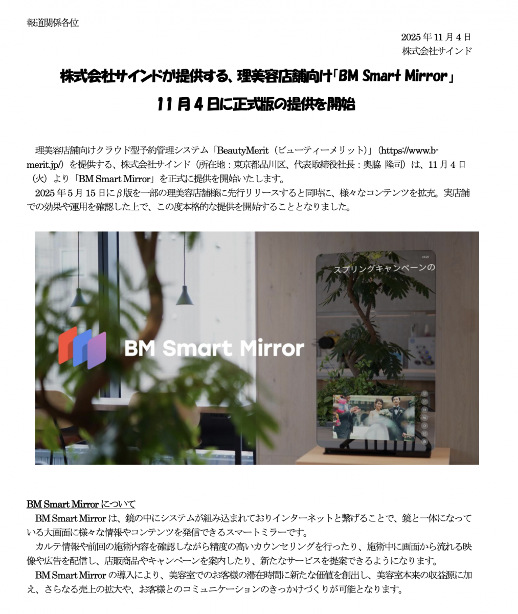 東証グロース市場に上場する株式会社サインドが提供する「BMSスマートミラー」の公式リリースに際し、弊社でも取扱いと活用コンサルティングのサービスがスタートしました。